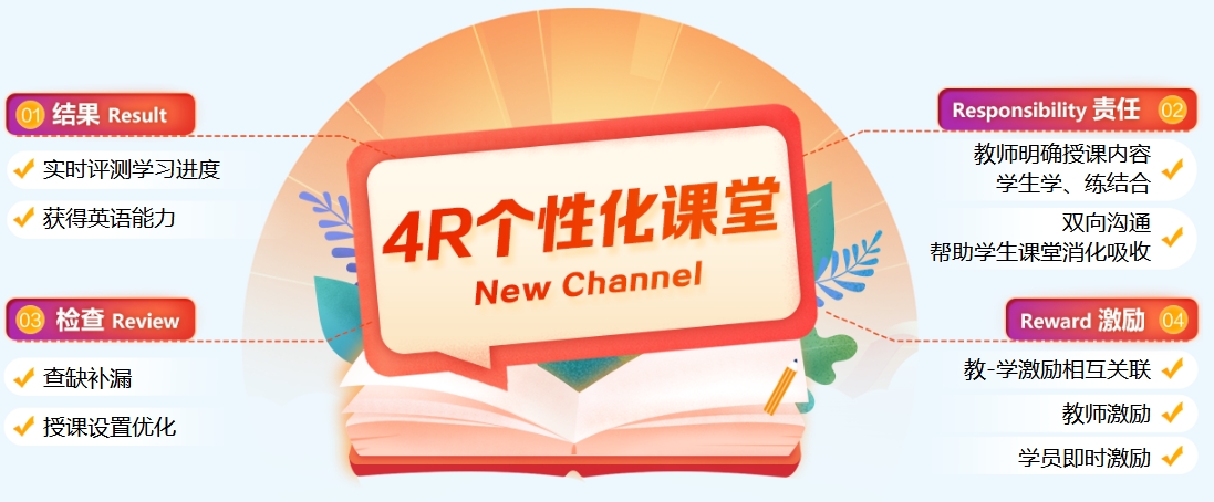 4R,代表着Result (结果)、Responsibility (责任)、Review (检查) 和Reward (激励)。四者有机结合,形成“以结果为起点,又以结果为归宿” 的科学、实用的系统。 新航道将4R系统运用于个性化课堂,把复杂的问题简单化、简单的事情量化、量化的事情标准化,输出学员专属解决方案。 |